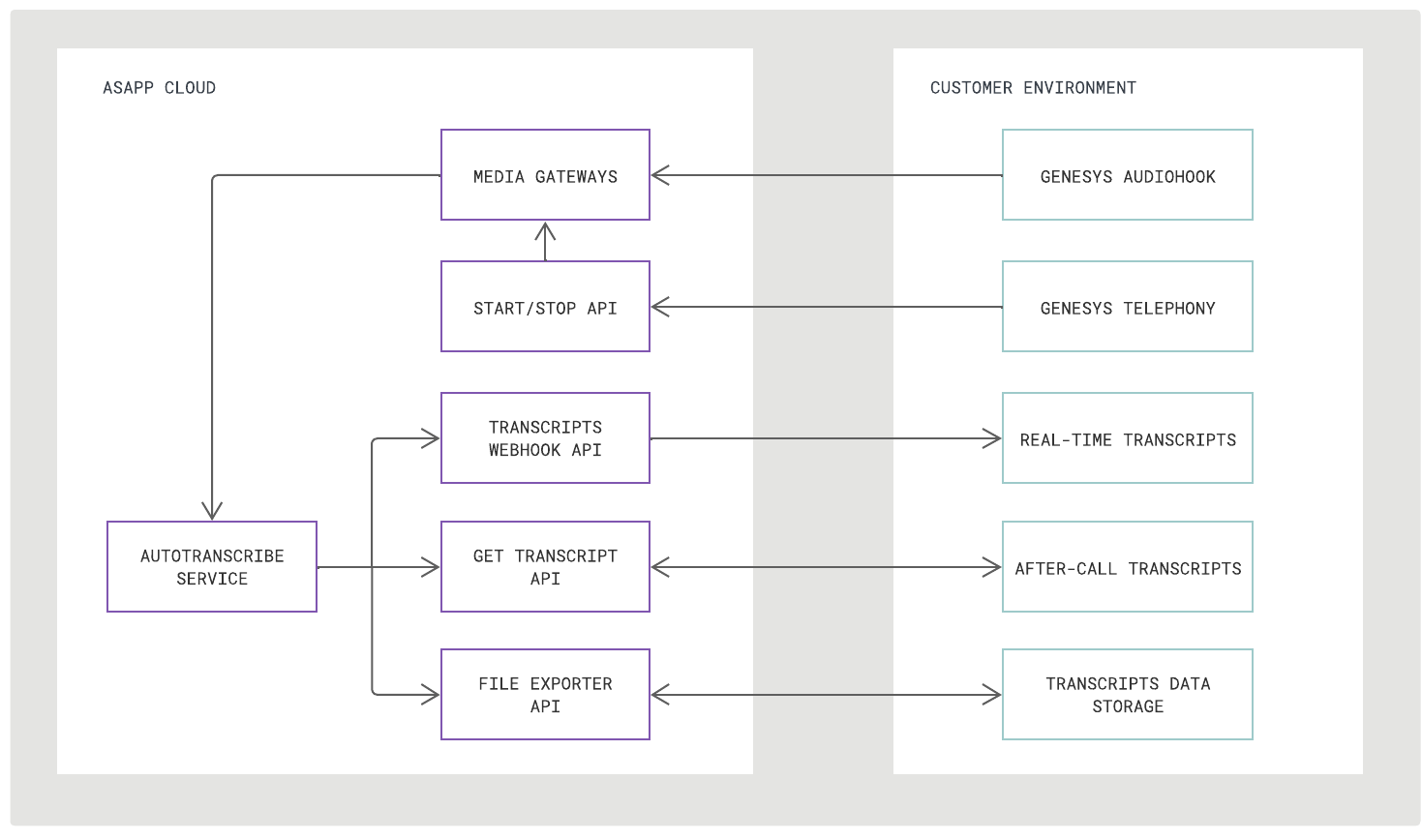 endpoints of the Start/Stop API are used to control when transcription occurs for every call media stream (identified by the Genesys conversationId) sent to ASAPP’s media gateway. See the Endpoints section to learn how to interact with them.