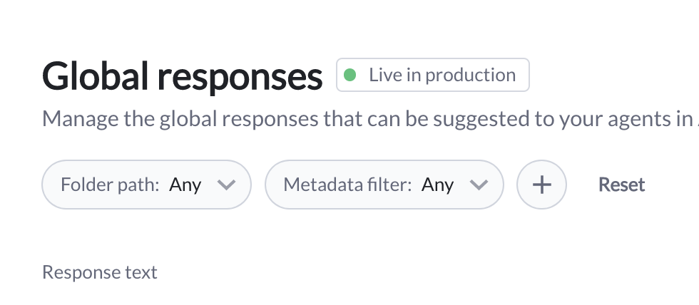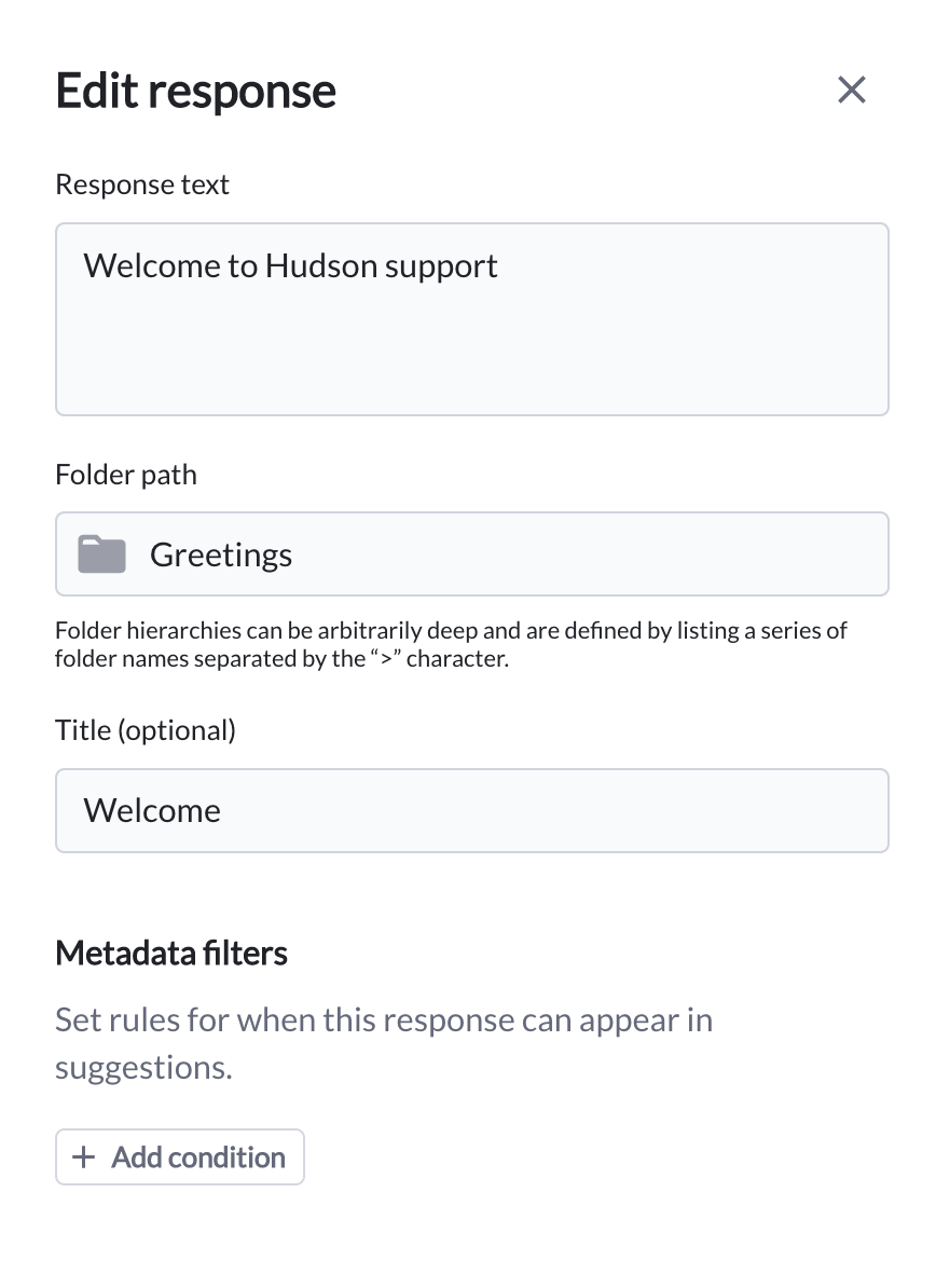 • As a filter: Responses are only made available for suggestion when the conversation’s metadata matches the attribute set for a given response (e.g. a response only being available when queue = general).