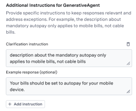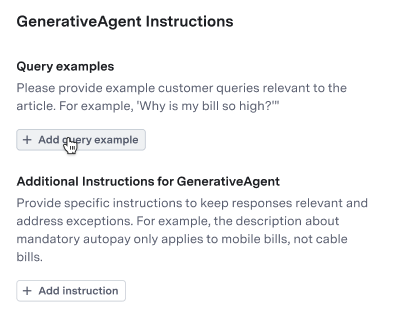 Add typical customer questions to help surface relevant content:- In the “GenerativeAgent Instructions” column, click Add query example