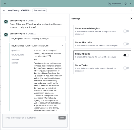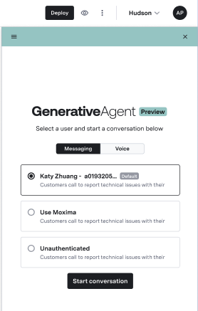 Quickly test live how GenerativeAgent uses your knowledge base:- Click the eye icon next to “Deploy”