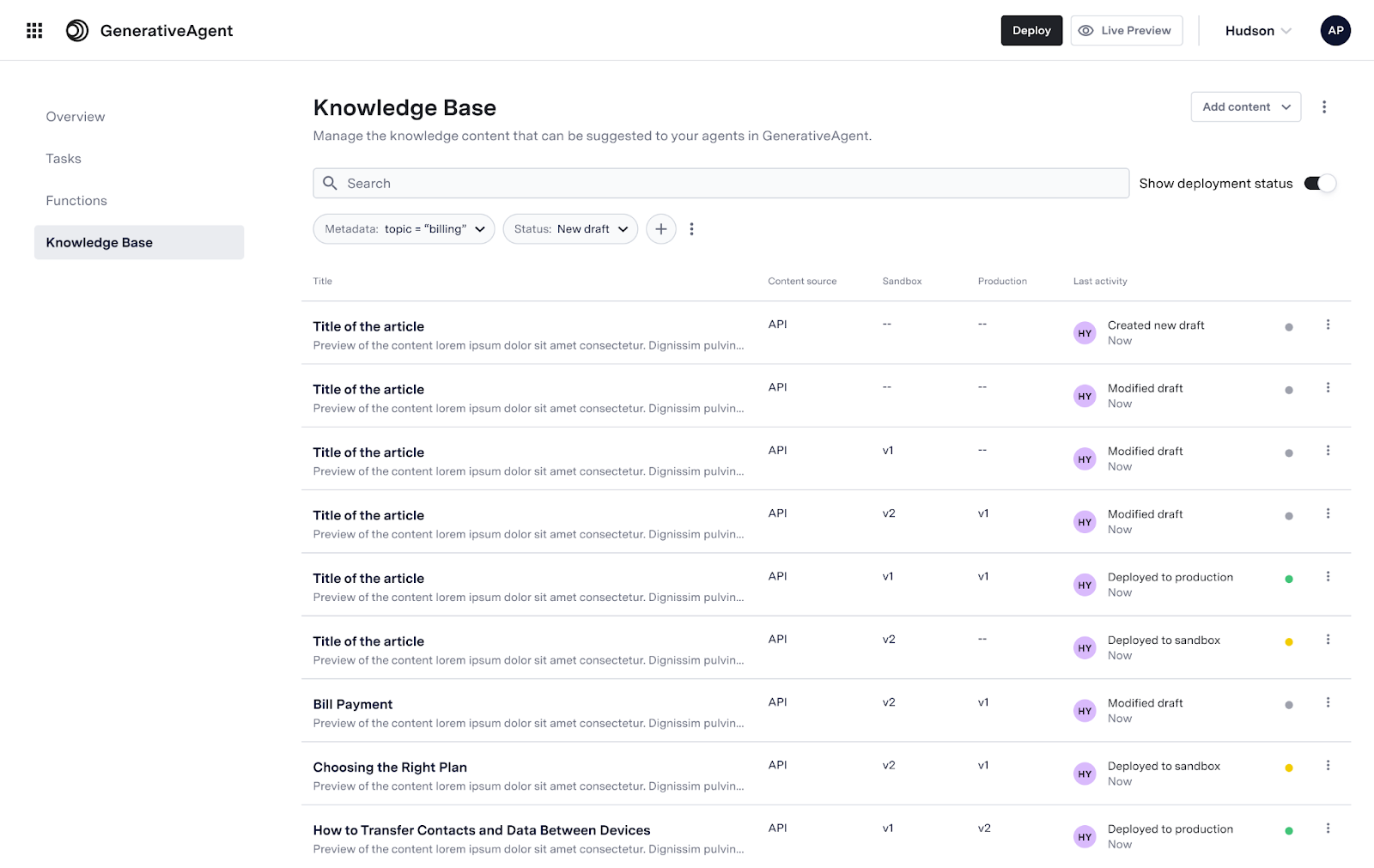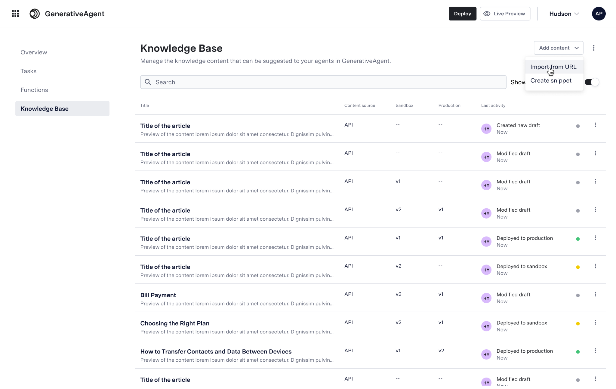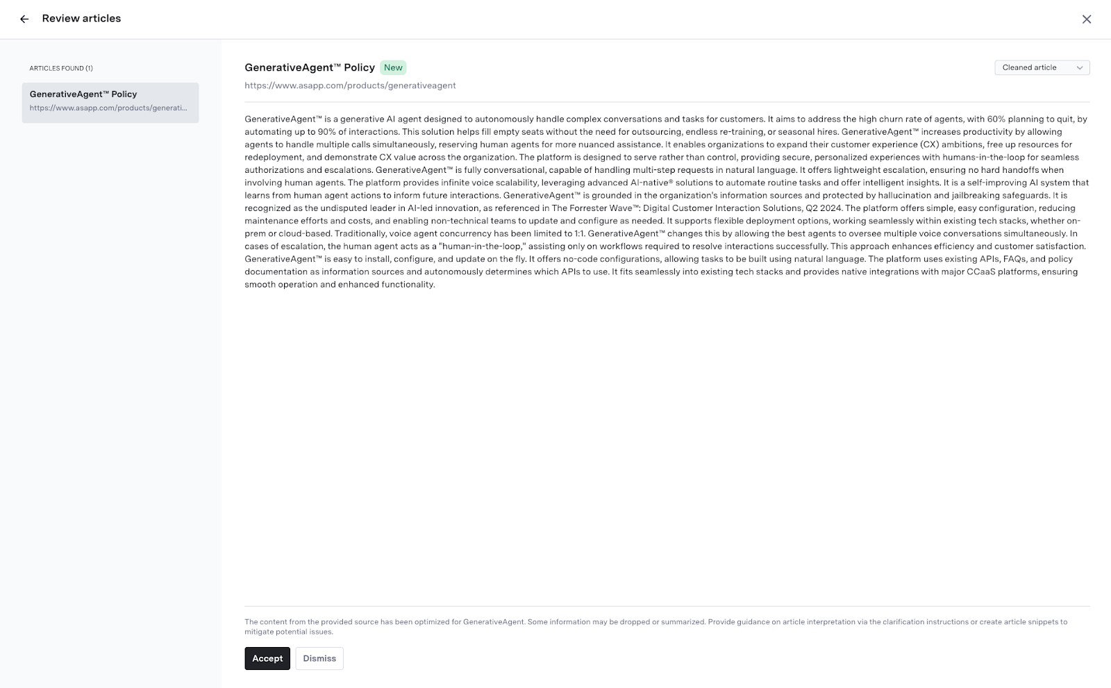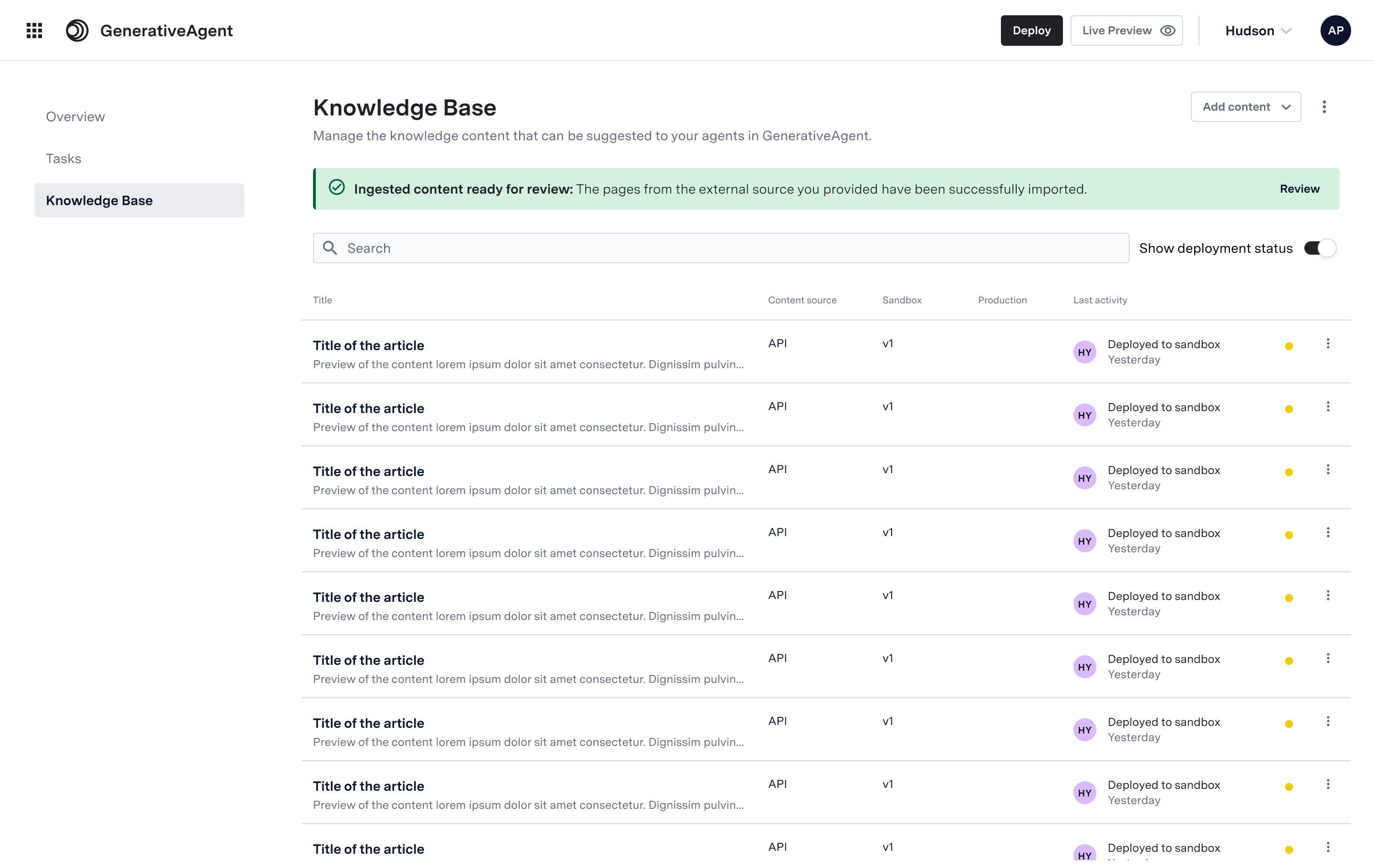 Once imported and configured, deploy your Knowledge Base and changes to your desired environment for GenerativeAgent. This ensures users receive the most accurate and timely information. Deployment is managed as part of the generative agent deployment process.Reviewing Imported Articles