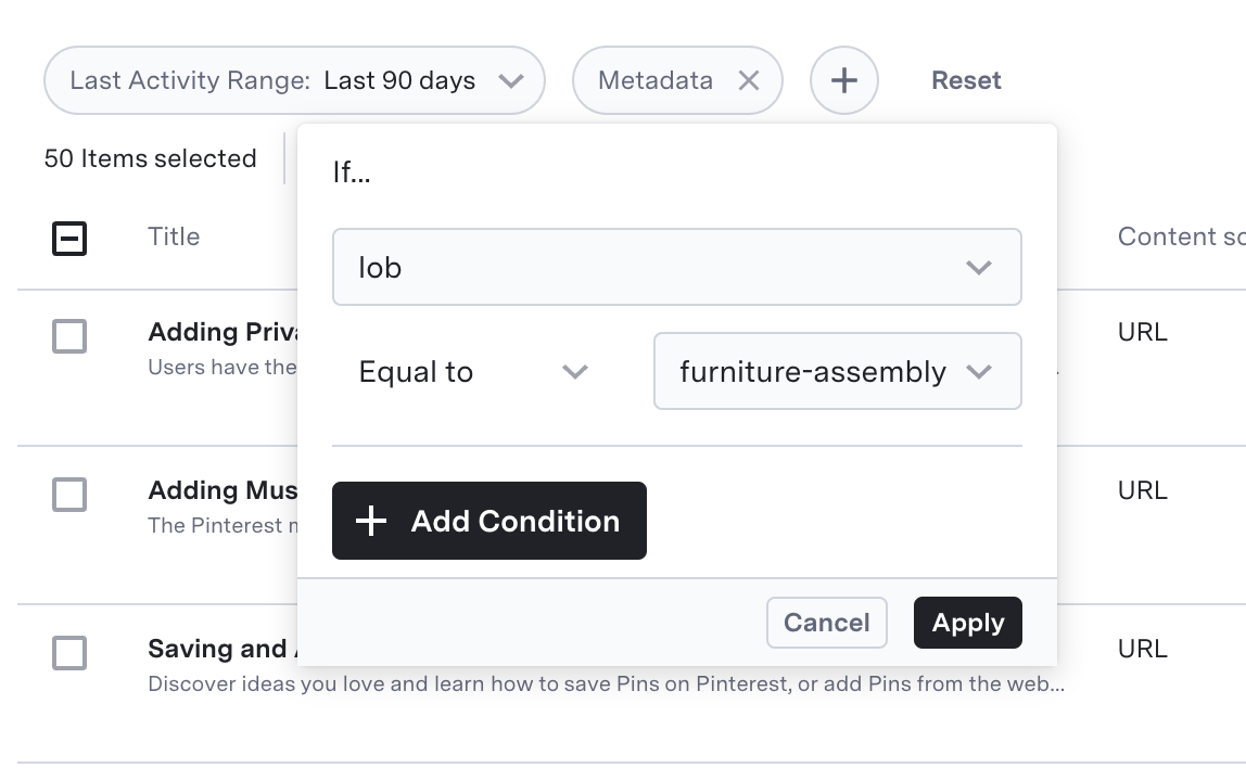 Easily find or bulk manage articles using metadata, status, content source, creator, or deployment state.