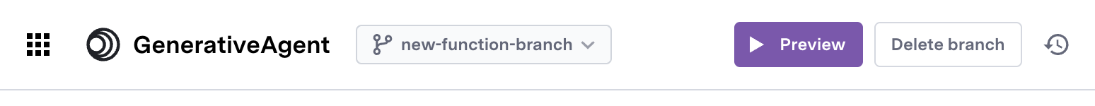 Branching allows you to test new ideas, such as adding a new task or function, or changing instructions dramatically, without modifying the main version of GenerativeAgent. Think of a branch as your own “playground” to experiment and make changes freely—knowing the main configuration stays safe. Once you’re happy with your changes, you can bring them into the main setup to share with the rest of your team. GenerativeAgent allows users to create local branches of configurations. This feature enables experimentation and collaboration without affecting the main configurations. Local branches provide a safe environment for testing changes to tasks, functions, and settings.Creating a New Branch