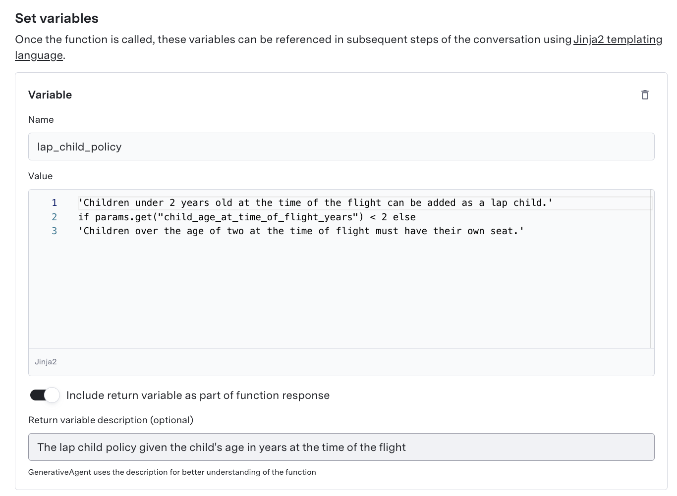 - Toggle “Include return variable as part of function response” to make the new variable immediately available to GenerativeAgent after the function call.