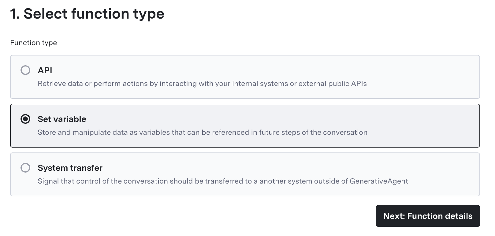 Navigate to the Functions page and click “Create Function.”- Select “Set variable” and click “Next: Function details”