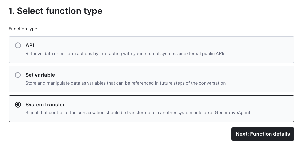 Navigate to the Functions page and click “Create Function.”- Select “System transfer” and click “Next: Function details”