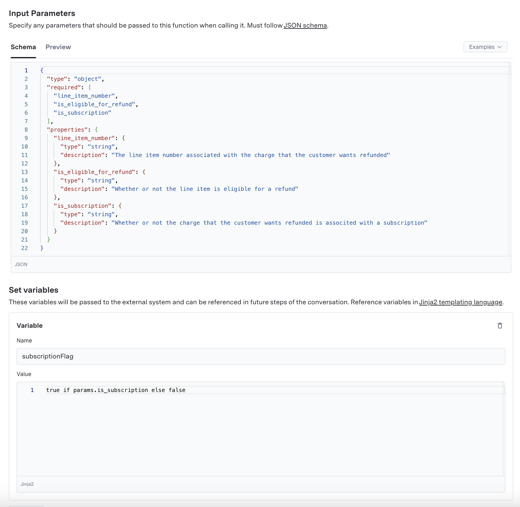 issue_refund_request). - Function Purpose: Briefly describe what the function does (e.g., “Takes the collected charge info and indicates a refund request should be processed”).