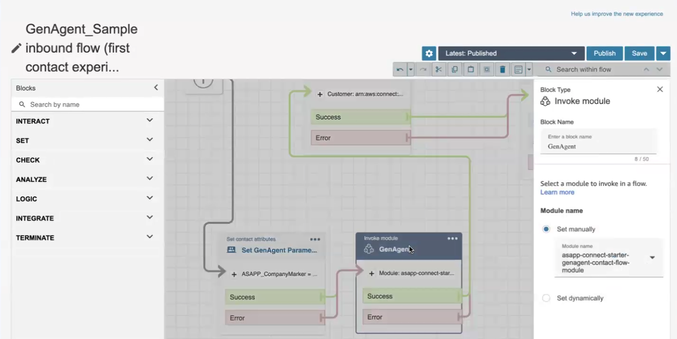 Create an “Invoke module” block and select the GenerativeAgent Flow Module. This is where the conversation is handed off to GenerativeAgent.