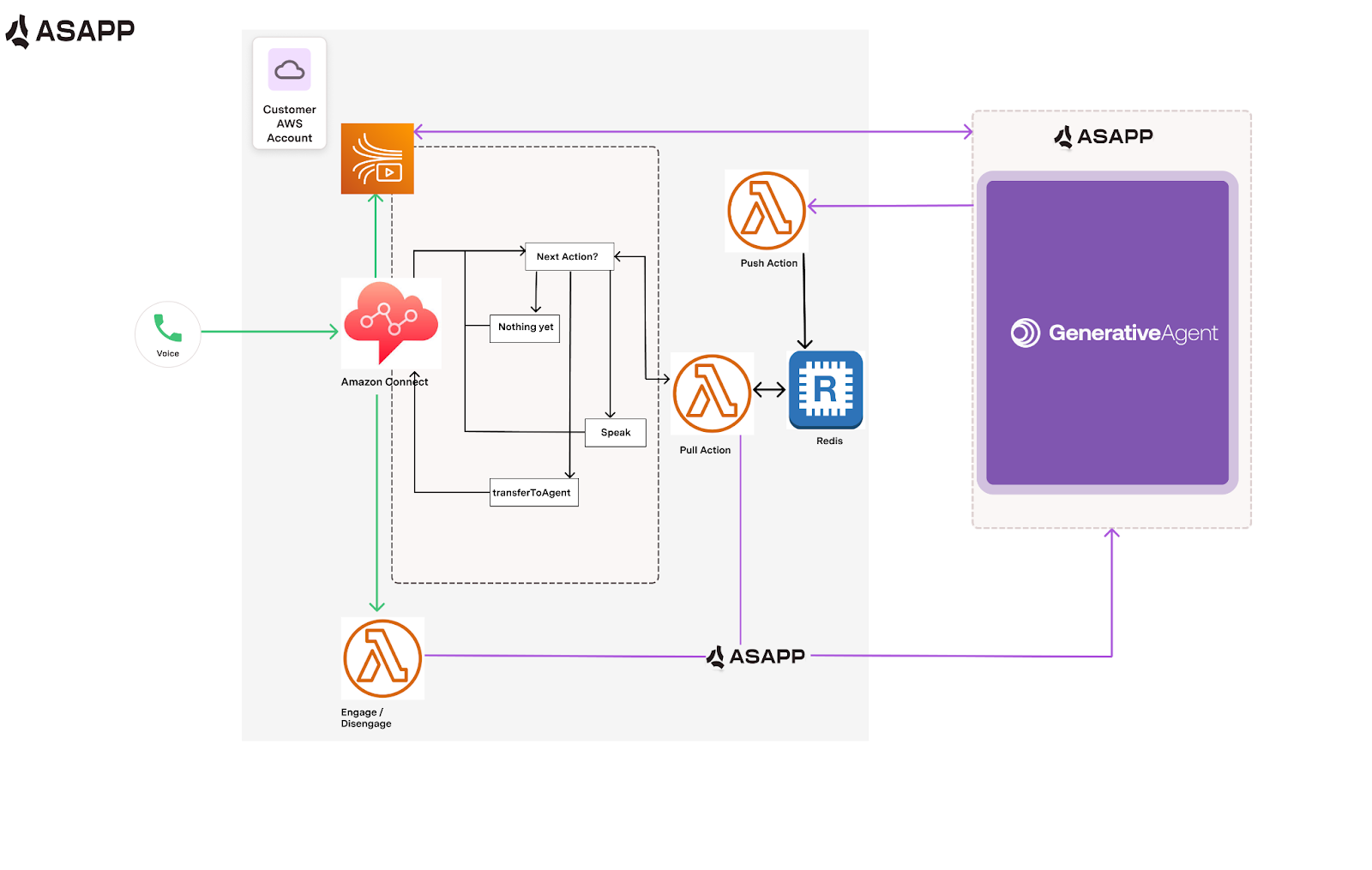 - GenerativeAgent handles the conversation using Lambda functions to communicate with ASAPP’s APIs, and respond to the caller using AWS’s Text to Speech (TTS) service.