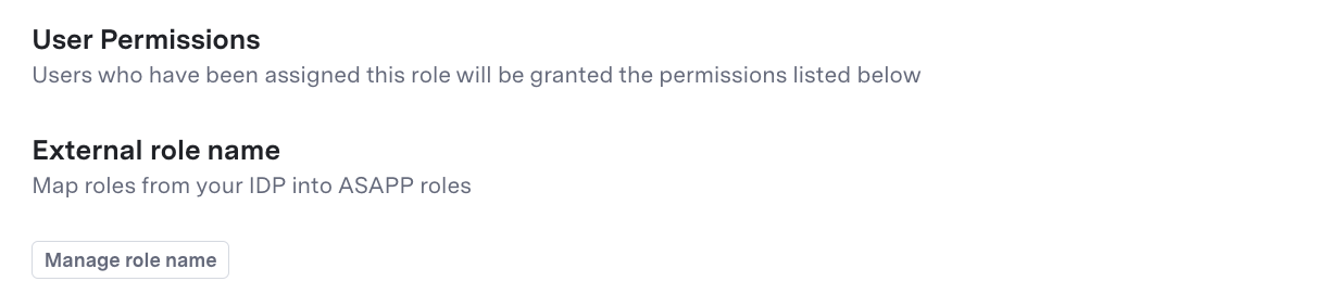 If you are using SSO, you can map roles in your Identity Provider (IDP) to the roles in ASAPP, allowing you to manage access to ASAPP via your own IDP. You must work with your ASAPP account team to determine which claim from your IDP contains the roles list. For each role in ASAPP, you specify one or more roles within your IDP that should be mapped to it. You can map multiple ASAPP roles to the same IDP role.