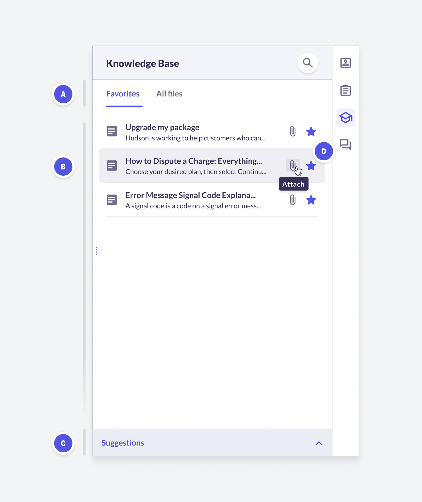 Knowledge Base (A) | Agents can traverse a folder hierarchy of customer company specific content to search, add a favorite, and send content to customers. Select Favorites or All Files. | Requires you to upload and maintain Knowledge Base content via Admin or an integration. |