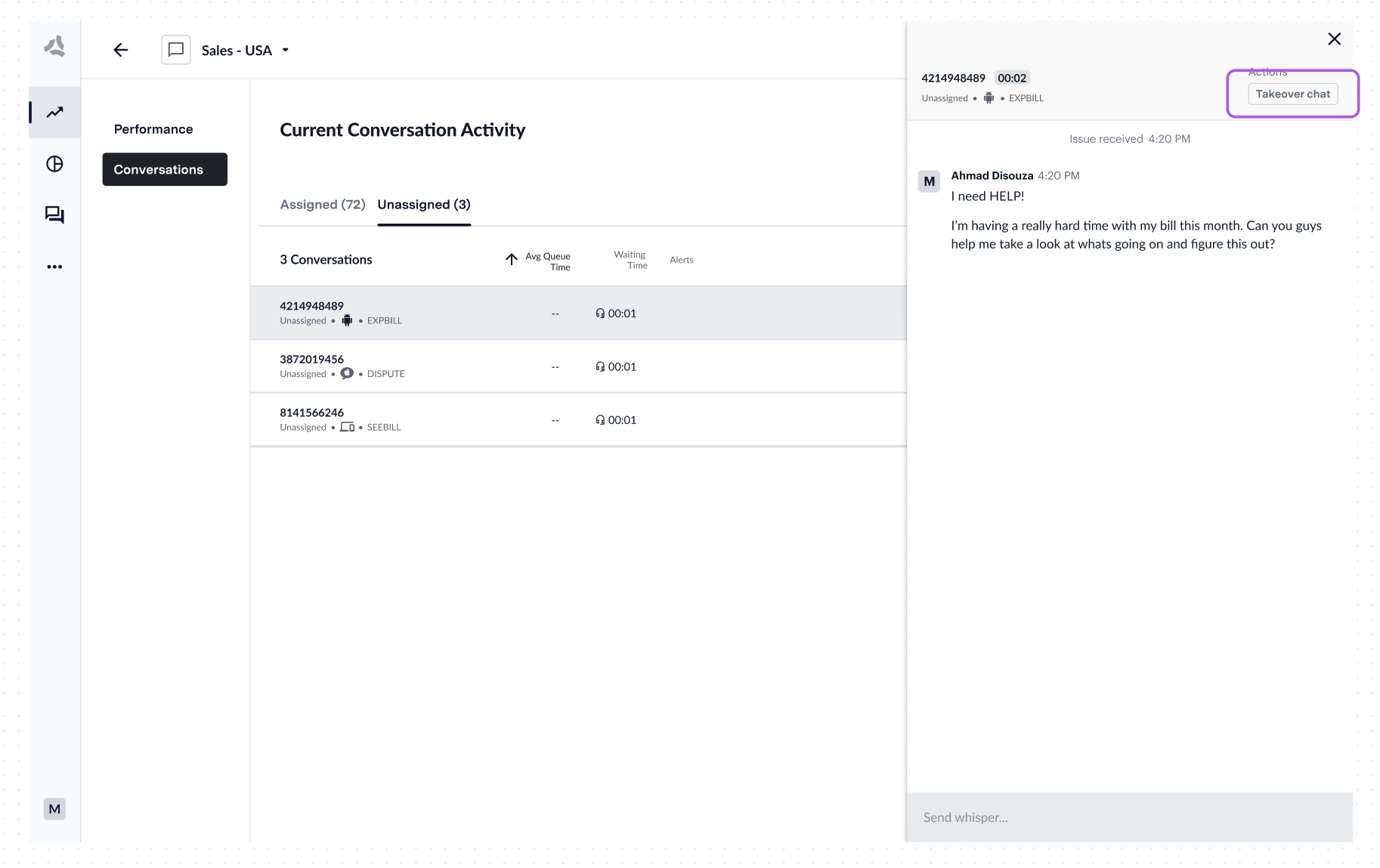Administrators (managers or supervisors) can take over chats from agents or unassigned chats in the queue. This feature is useful for:- Closing resolved chats that need disposition