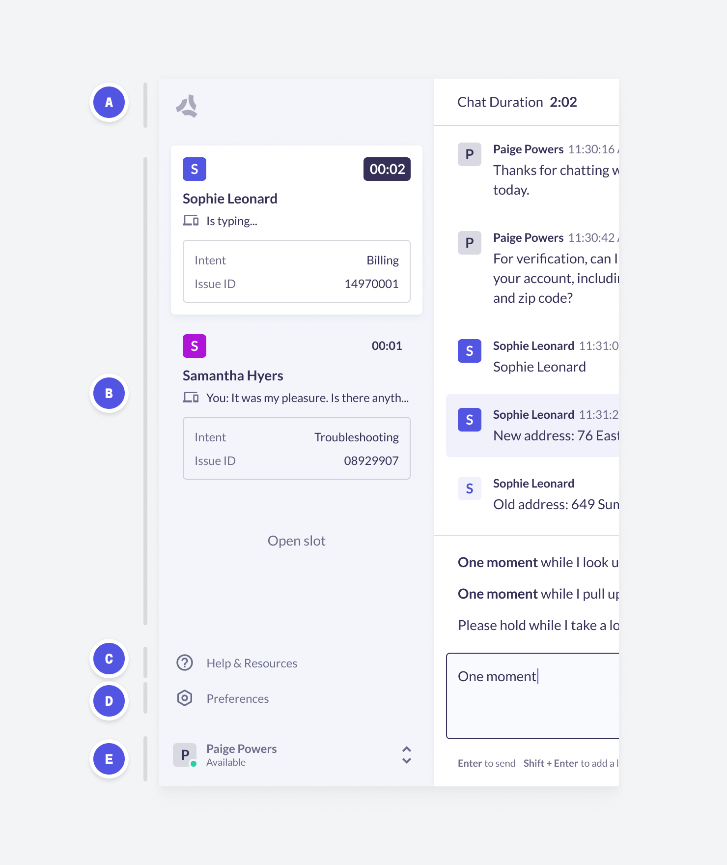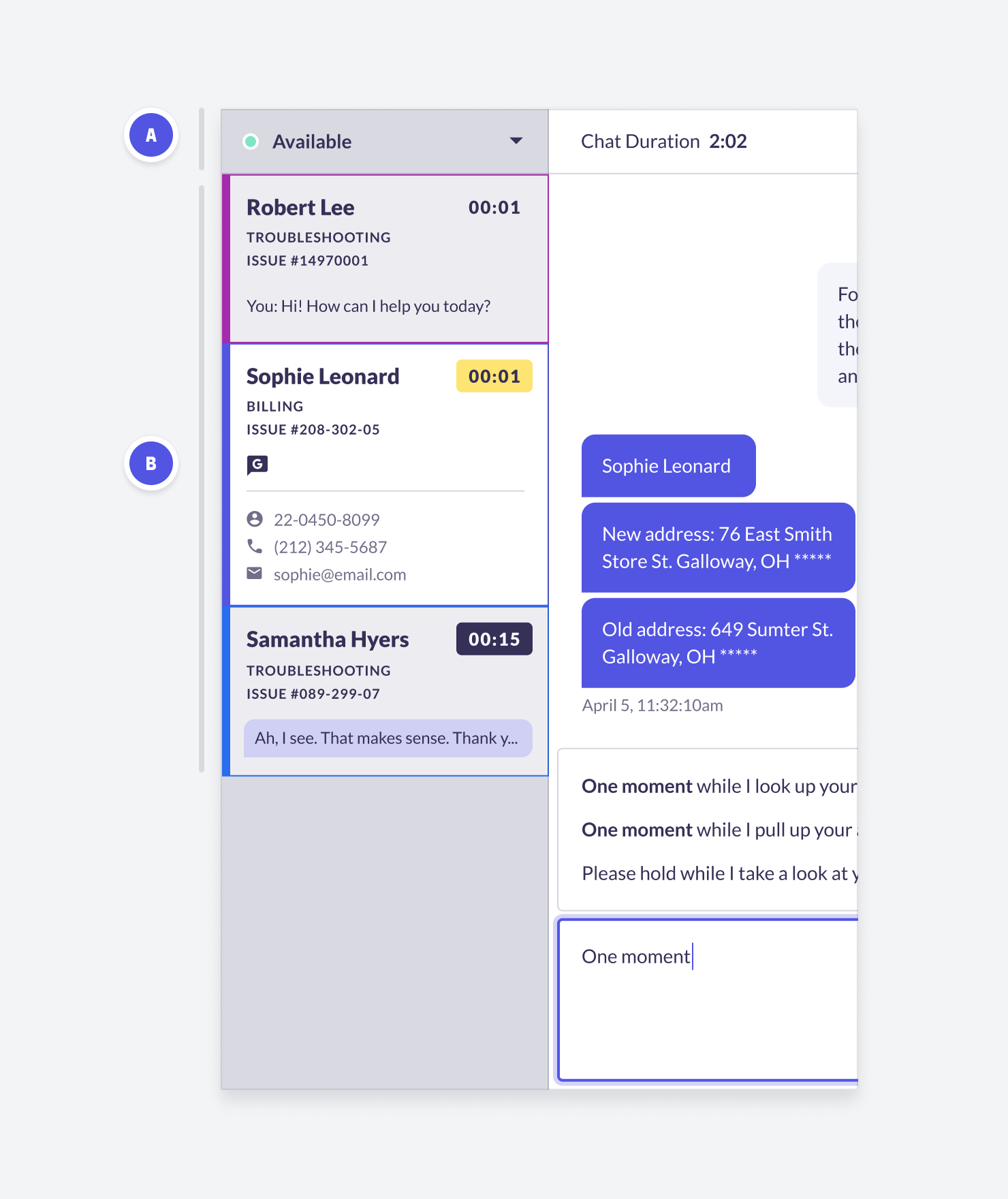 Waiting Timers | A timer will display, both if the customer is waiting and if the agent is waiting. The customer waiting time displays in larger text and with a badge around it. | Core |