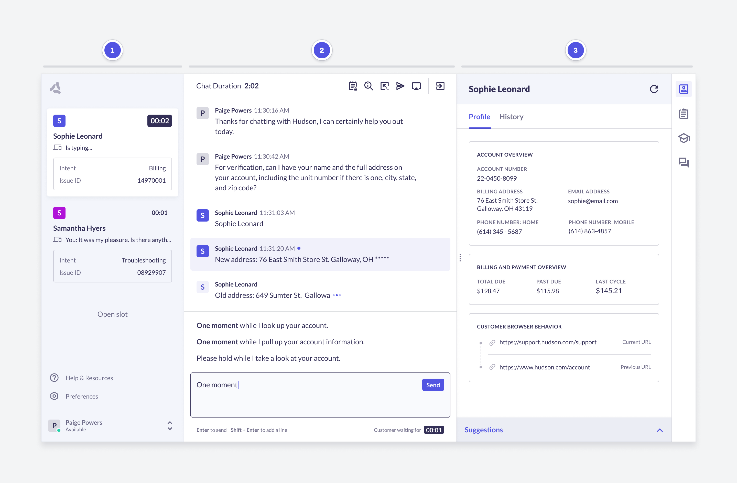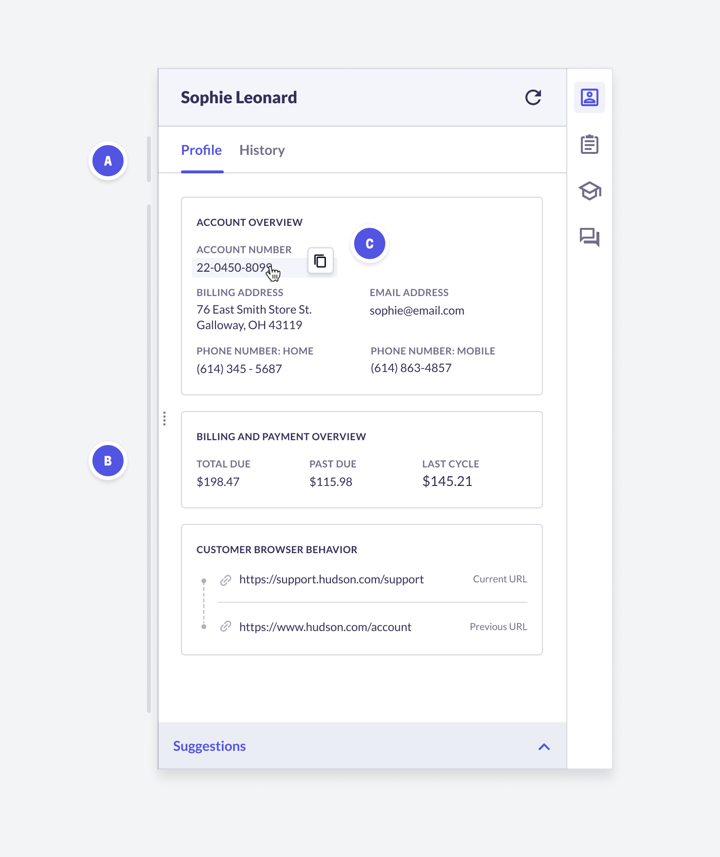 Customer History (B) | A separate tab that gives a quick snapshot of each current and historical interaction with the customer, including time, duration, notes, intent, etc. | Core |