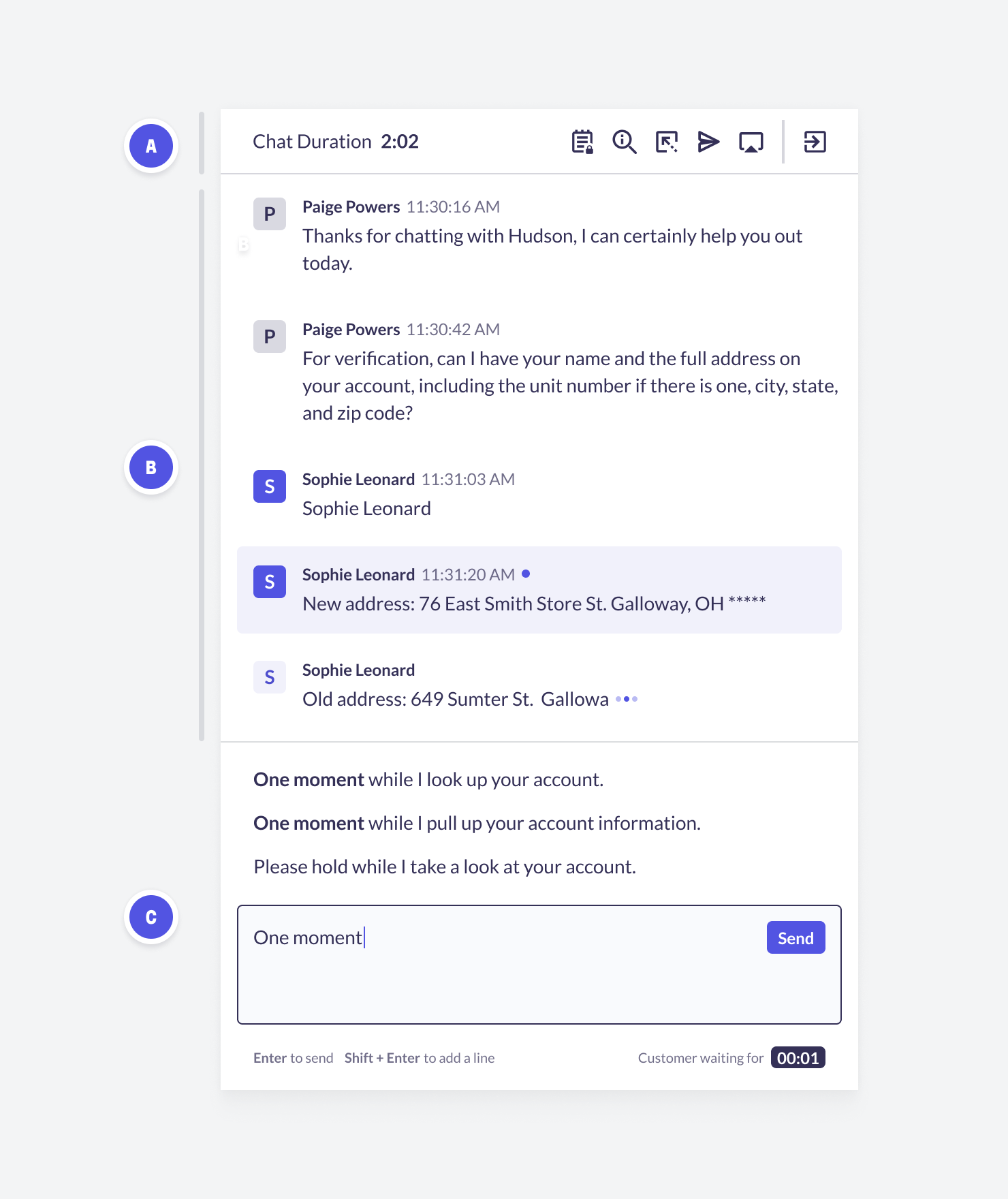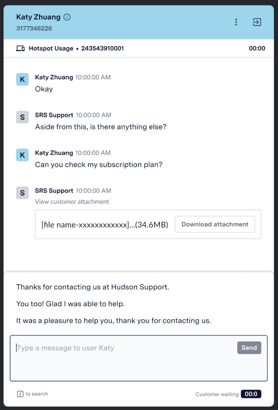 Waiting Timers | A timer will display, both if the customer is waiting and if the agent is waiting. The customer waiting time displays in larger text and with a badge around it | Core |