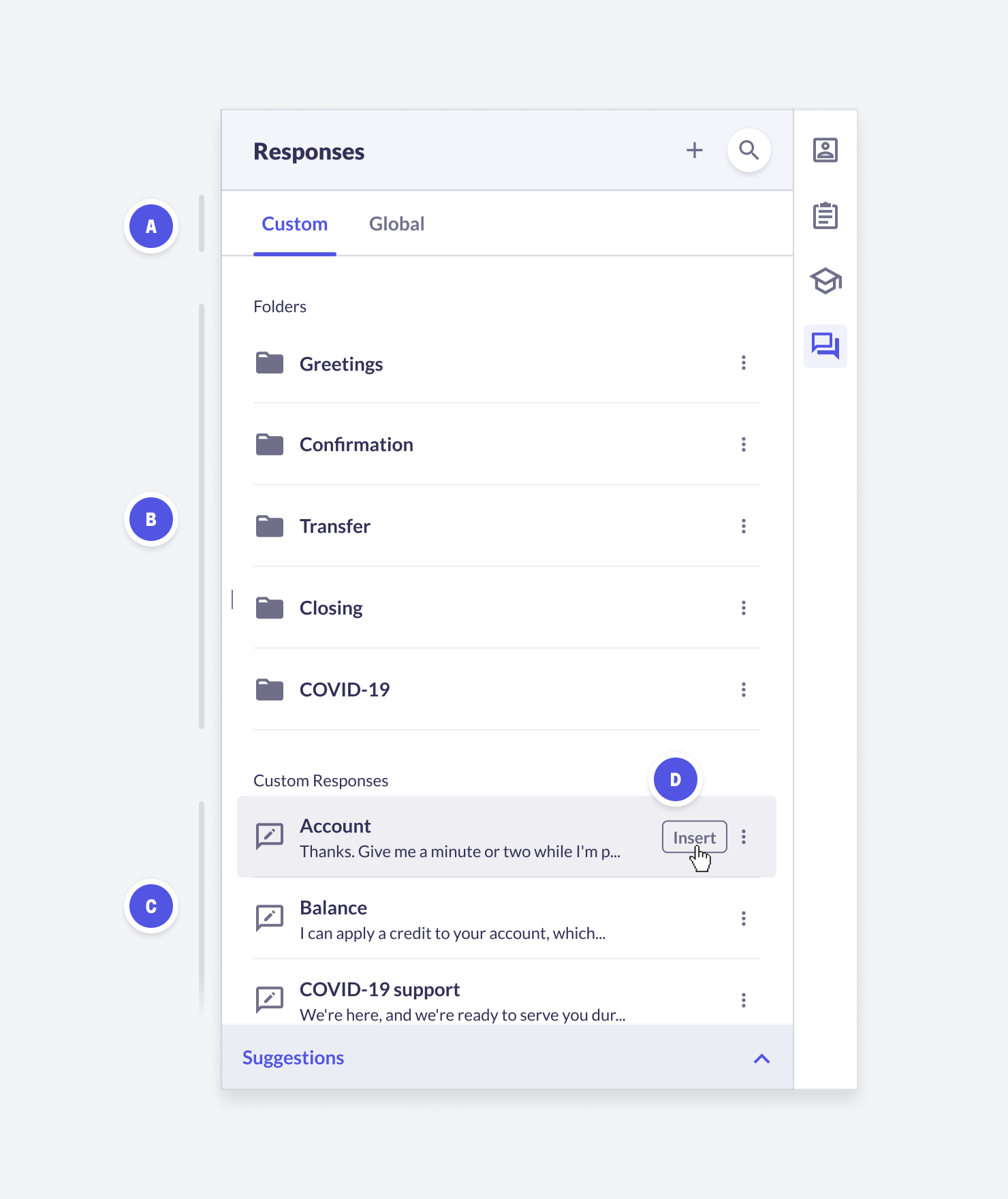 Click-to-Insert (D) | In both the custom and global response libraries, agents can hover over a response and click Insert to insert the full text of the selected response into the typing field. | Core |