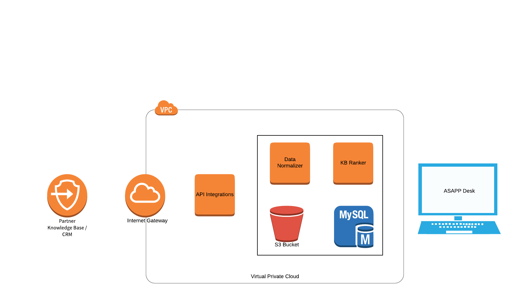 ASAPP can integrate with customer Knowledge Base systems or CRMs to pull data and make it available to Agent Desk. This is accomplished by a dedicated service, which can consume data from external systems that support standard REST APIs. The service layer is flexible enough to integrate with various industry standard Knowledge Base systems as well as in-house developed proprietary ones. The service programmatically retrieves new and updated articles on a regular basis to surface fresh and accurate content to agents in real-time. Data pulled from external systems is transformed into ASAPP’s standard format, and securely stored in S3 and in a database. Refer to the Data Storage section below for more details.Configuration