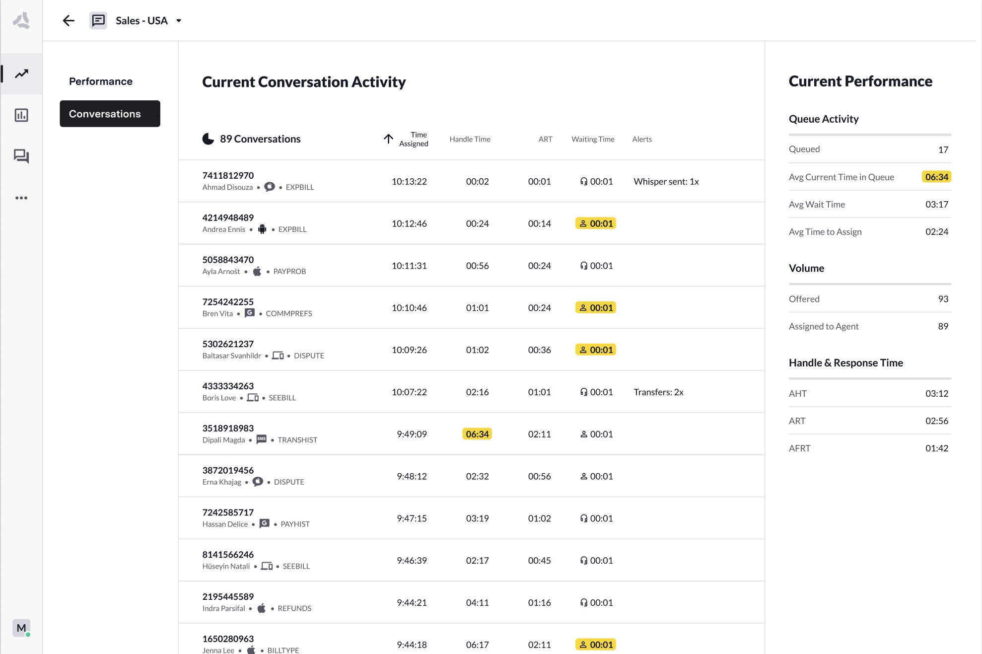 - Keep an eye on all your live performance metrics such as handle time, queue volume, and resolution rate