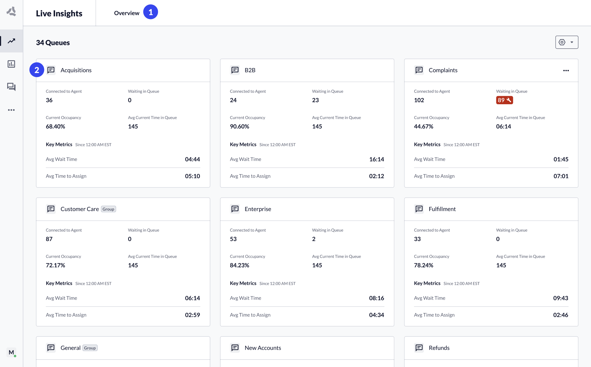 - All Queues → Provides a performance overview of all queues and queue groups. Also provides customization tools to show/hide queues and create/manage queue groups.