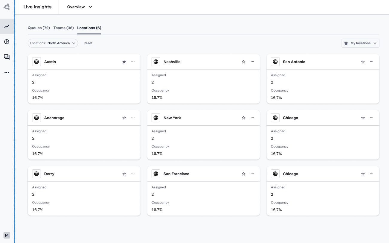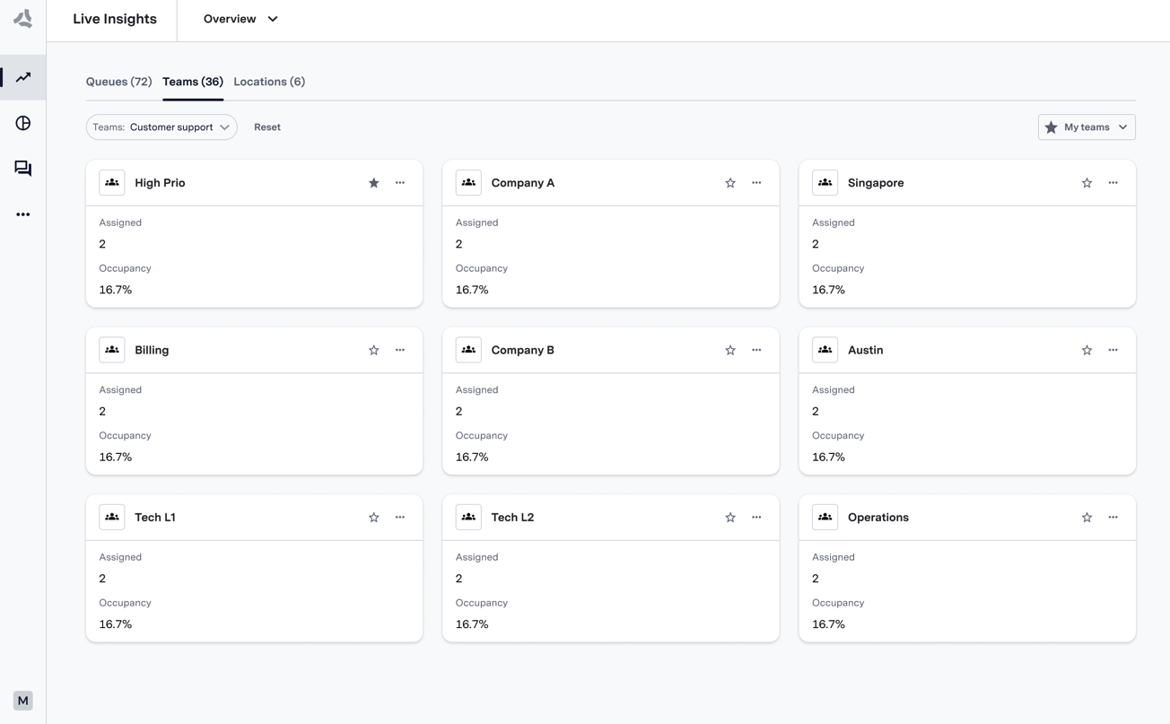 Admins can filter teams by type of role and review each company assigned to the team. Also, each result shows the size and the occupancy of each team. Each administrator can provide an hourly update of how many agents are active, on lunch, or in a different state as well as view corresponding metrics.