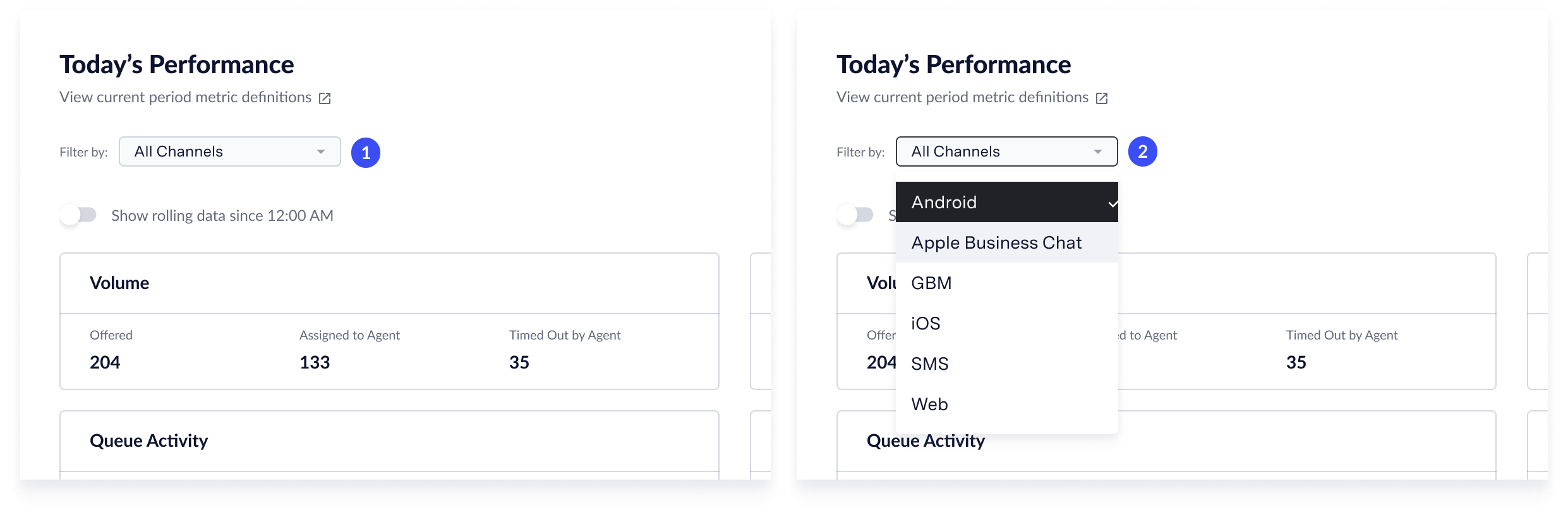 - Channel filter: Filter performance data by channel. On click, channel options display. Select options to automatically filter data.