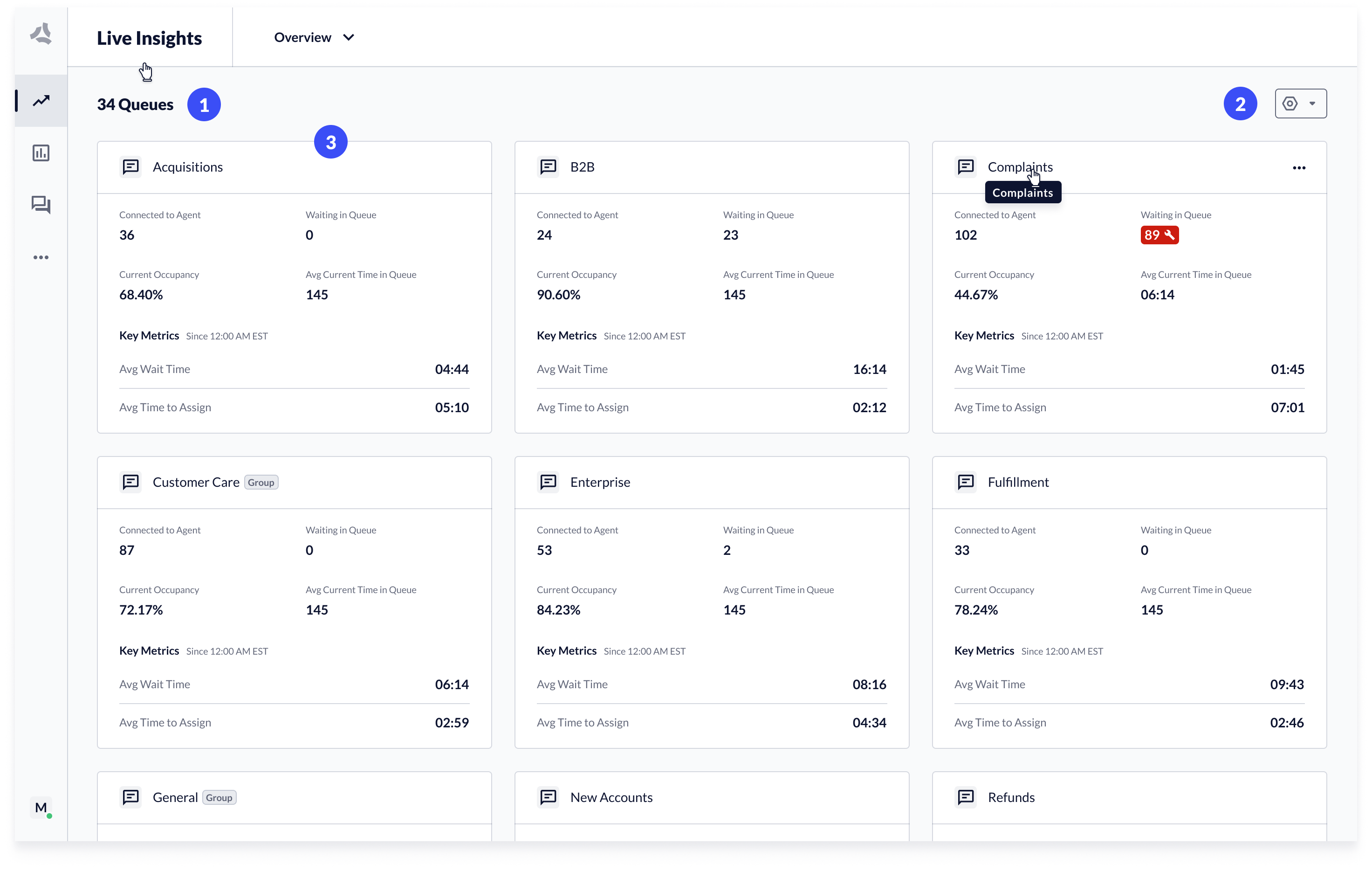 - Single Queues & Queue groups: Displays performance overview for each queue and queue groups. Each tile leads to a drilled down view.