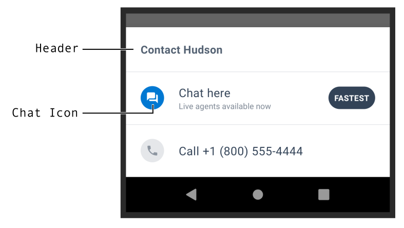 call:to initialize Chat Instead. Depending on cache, this will trigger a network call so channels are “immediately” available to the user once the fragment is displayed. Along with an optional header and a chat icon, you can pass callbacks to be notified when a channel is tapped or an error on a channel happens. ASAPP makes both callbacks after Chat Instead has tried to act on the tap. - Display Channels