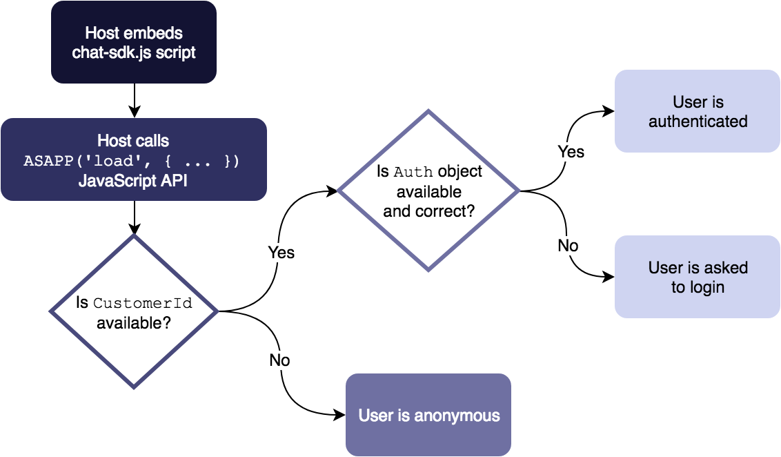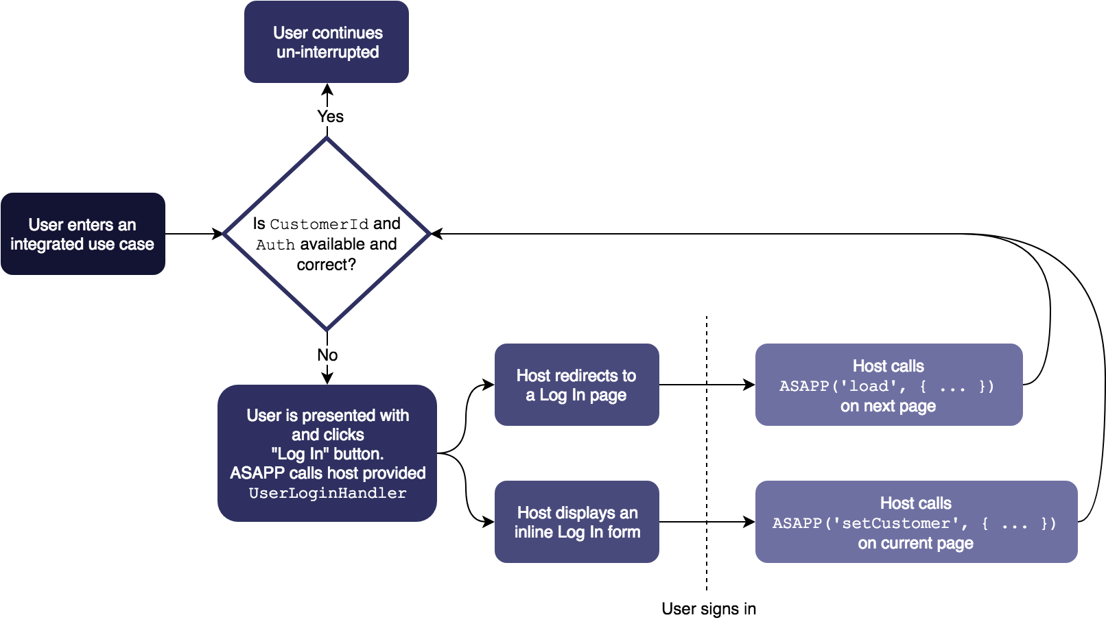 If a user who is already authenticated with your site requests a page that includes ASAPP chat functionality, you can proactively authenticate that user to the ASAPP SDK at page load time. This allows an authenticated user who initiates a chat session to have immediate access to their account details without having to login again. To authenticate a user to the ASAPP Chat SDK on page load, use the ASAPP Load API providing both ContextProvider and CustomerId as additional keys in the Load method. For example:CustomerId