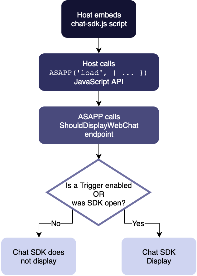 A Trigger is an ASAPP feature that allows you to specify which pages display the ASAPP Chat UI. You may choose to show the ASAPP Chat UI on all pages where the ASAPP Chat SDK is embedded and loaded, or on just a subset of those pages.You must enable at least one Trigger in order for the ASAPP Chat UI to display anywhere on your site. Until you define at least one Trigger, the ASAPP Chat UI will not display on your site.