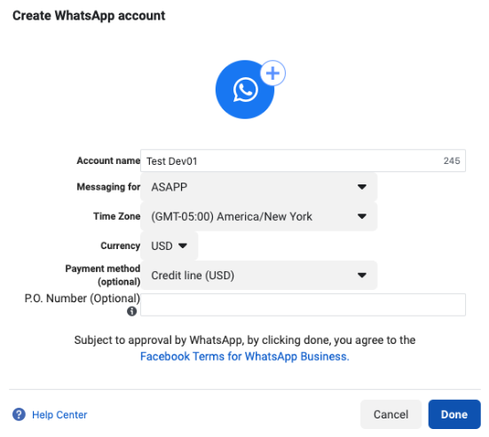 Before integrating with ASAPP’s WhatsApp adapter, you must create a Business Manager (BM) account with Meta - visit this page for account creation. Following account creation, Meta will also request you follow a business verification process before proceeding.Create WhatsApp Business Accounts (WABAs)