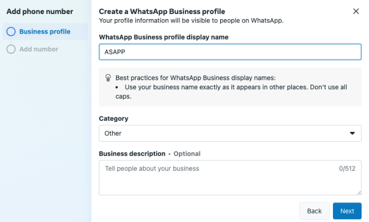 As part of the signup flow, each WABA must have at least one phone number assigned to it (multiple phone #s per WABA are supported). Before adding a number, you must also create a profile display name, which must match the name of the Business Manager (BM) account.