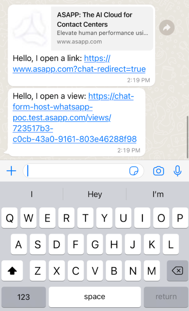 Entry points are where your customers start conversations with your business. You have the option to embed a WhatsApp entry point into your websites in multiple ways: a clickable logo, text link, on-screen QR code, etc. You can also direct to WhatsApp from social media pages or using Meta’s Ads platform to provide an entry point. Ads are fully configurable within the Meta suite of products and will result in no costs incurred for conversations that originate via interactions with them.ASAPP does not currently support Chat Instead functionality for WhatsApp.