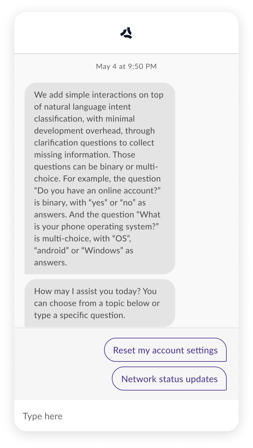 Sometimes customers initiate conversations with vague utterances like “Help with bill” or “Account issues.” In these cases the virtual agent understands enough to classify the customer’s intent, but not enough to immediately solve their problem. In these cases, you are able to design a flow that asks follow-up questions to disambiguate the customer’s particular need. Based on the customer’s response you can redirect them to more granular intents where they can better be helped. Designing effective disambiguation starts with reviewing historical conversations to get a sense of what types of issues customer’s are having related to the vague intent. Once you’ve determined these, you’ll want to optimize your prompt and response routes for the channel your designing for:(a) ASAPP SDKs