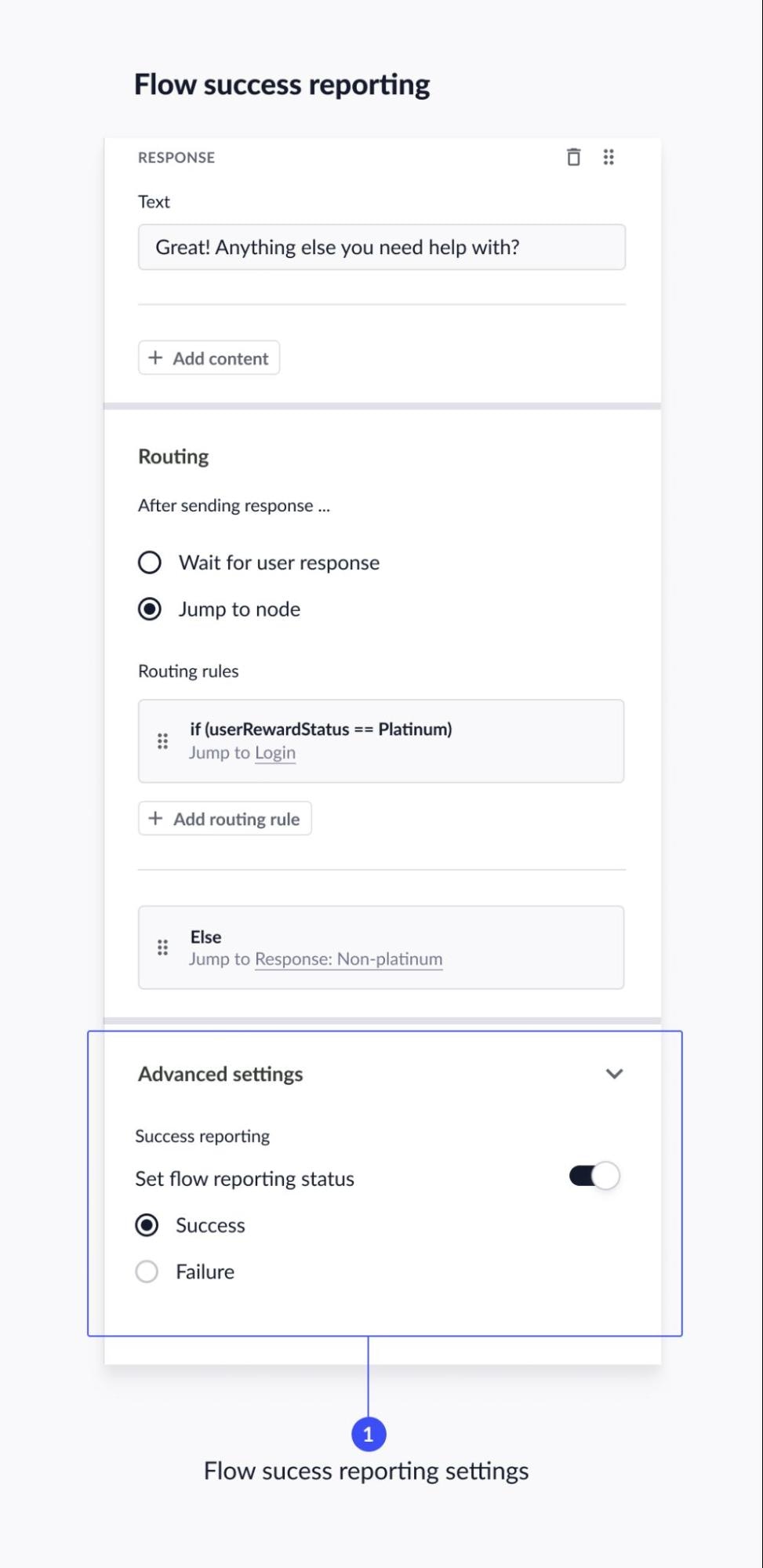 When you are designing a new flow or modifying an existing flow, be sure to enable flow success when you have provided useful information to the customer. “Flow success” is defined as when a customer arrives at a screen or receives a response that:- Provides useful information addressing the recognized intent of the inquiry.