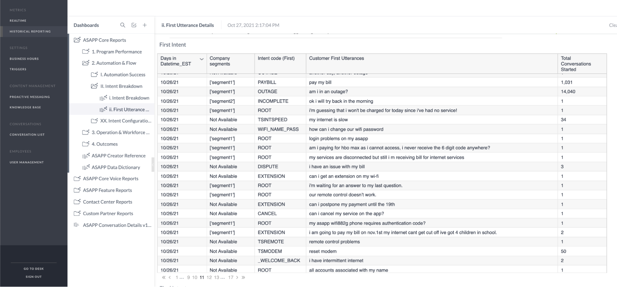 Since flows are invoked when ASAPP classifies an intent, understanding the intent in question is key to successfully designing a flow. The best way to do this is to review recent utterances that have been classified to the intent and categorizing them into more nuanced use cases that your flow must address. This will ensure that the flow you design is complete in its coverage given how customers will enter the flow. These utterances are accessible through ASAPP Historical Reporting, in the First Utterance table.
