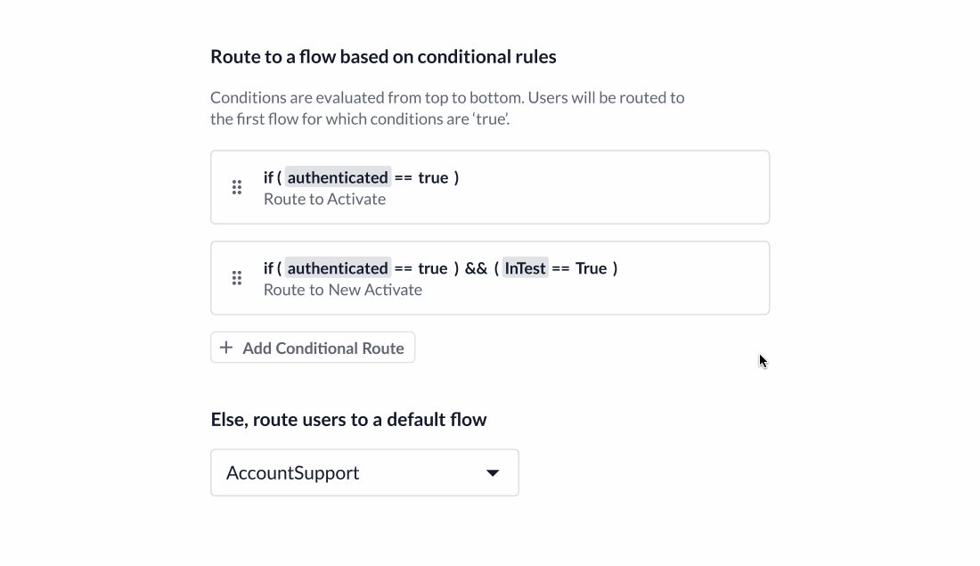 You can add multiple conditional rules that can route to different flows. You can reorder these conditions by dragging the conditional rule from the icon on the left. Once saved, conditions are evaluated from top to bottom, with the customer being routed to the first flow for which the conditions are validated. If no conditional route is valid, the customer will be routed to the default flow.